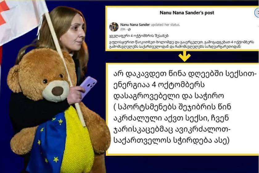 „არ დაკავდეთ წინა დღეებში სექსით – ენერგიაა 4 ოქტომბერს დასაგროვებელი და საჭირო (სპორტსმენებს შეჯიბრის წინ აკრძალული აქვთ სექსი, ჩვენ ჯარისკაცებმაც ავიკრძალოთ- საქართველოს სჭირდება ასე)“, – წერს რადიკალური ოპოზიციის აქტივისტი ნანა სანდერი.